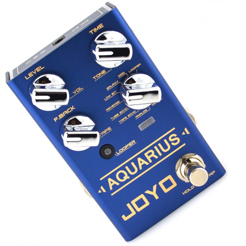 The JOYO R-07 Aquarius guitar effect pedal is a multi-mode delay guitar effect pedal & looper. Use it as a delay pedal, a looper pedal, or both at the same time. The Aquarius has 8 digital delay effects built in with tap tempo to set the delay time and has 300 second recording, playback, dub, stop and delete.